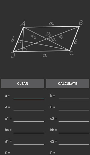 Parallelogramm - Seiten, Winkel, Höhe, Diagonalen, Winkel zwischen Diagonalen, Umkreis, Bereich.