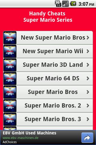 Already Update Ad format to compliance with Google Play Developer program PolicyHandy Cheats : Super Mario all seriesFeatures of the application include:Collections of Cheats and Codes for Super Mario Series as belowFor paper Mario, Mario RPG and other will contain in this App for next other versionNew Super Mario Bros. 2New Super Mario BrosNew Super Mario Bros. WiiSuper Mario 3D LandSuper Mario 64 DSSuper Mario BrosSuper Mario Bros 2Super Mario Bros 3Super Mario GalaxySuper Mario Galaxy 2Super Mario LandSuper Mario Land 2Super Mario Land 3All information and Important Data You can use this app although Offline.The most uptodate.Credits and SourcesCheats and Useful Information from many site of free cheats :http:www.gamefaqs.comhttp:www.ign.comhttp:www.cheatcc.comhttp:www.wikia.comWikiahttp:strategywiki.orgwikiMainPageLegal Notice:This guide is unofficial and is not authorized or created by the creator of the video game for which this guide was made for. This application complies with US Copyright law guidelines of quot;fair usequot;. If you feel there is a direct copyright or trademark violation that doesn39;t follow within the quot;fair usequot; guidelines, please contact us directly at choochai.poo@gmail.com to discuss.