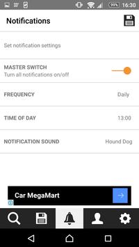 Set a notification to alert you hourly, daily or weekly to check Hound Dog - this can be turned on/off with a master switch - with the choice of 3 sounds to alert you.