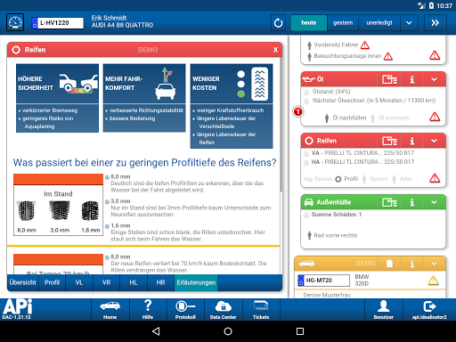 Arbeiten Sie individuell konfigurierte Checklisten vollständig ab, analysieren Sie Schäden an der Außenhülle, nehmen Sie alle Reifendaten auf, kalkulieren Sie mobil die zu erwartenden Reparaturkosten und erweitern Sie per Knopfdruck den Kundenauftrag.