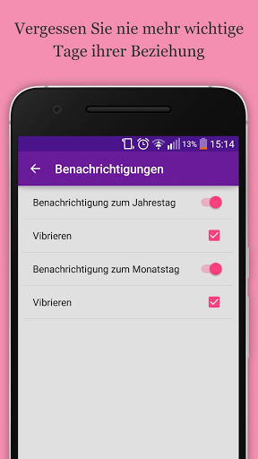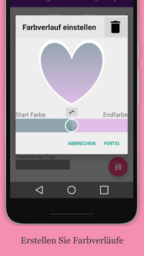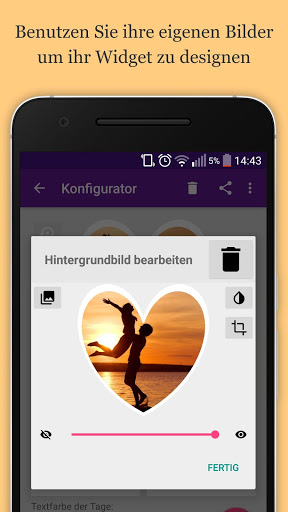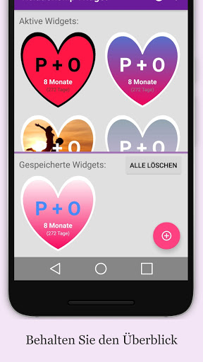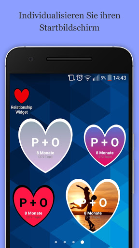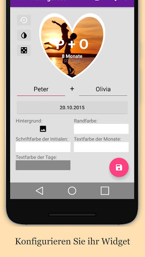 Mit dieser App werden Sie Monats- und Jahrestage ihrer Beziehung nie wieder vergessen! Sie bietet ihnen die Möglichkeit, ein personifizierbares Widget in Herzform auf ihrem Homescreen zu platzieren, welches ihnen stets anzeigt, wie lange Sie schon in ihrer Beziehung sind.