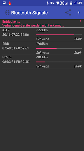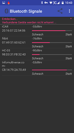 Es wird die Signalstärke in dBm aller nicht angeschlossenen Bluetooth-Geräte angezeigt, die es aufnimmt. Eine Liste der Geräte mit ihren Bluetooth-Namen und MAC-Adressen wird jeweils mit einem Signalstärke-Meter angezeigt. Sie können dies verwenden, um Ihr fehlendes FitBit oder ein anderes Bluetooth Gerät zu finden. Sie können es auch verwenden, um Bluetooth-Konnektivitätsprobleme zu debuggen.