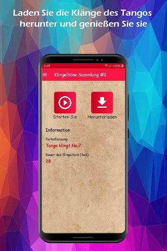 Für den ordnungsgemäßen Betrieb der Tangotöne-Anwendung ist eine Internetverbindung erforderlich. Genießen Sie unsere neue App mit Tangotönen für Mobiltelefone (verwenden Sie diese als Klingeltöne, SMS-Töne, Alarm oder Benachrichtigung) und genießen Sie diese hervorragenden Klingeltöne. Ohne Internet- oder Datenverbindung funktioniert es nicht richtig.