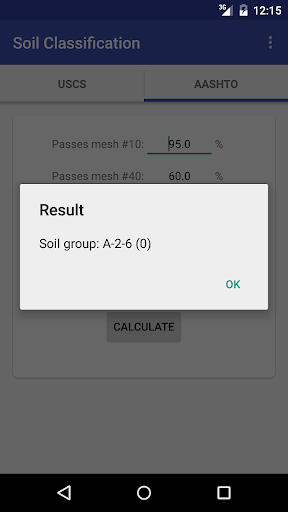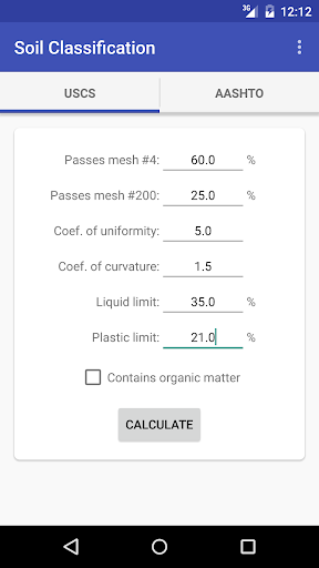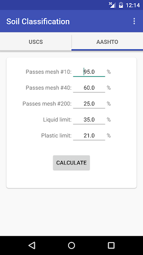 Nützliche App, um Bodenproben gemäß dem einheitlichen Bodenklassifizierungssystem oder dem AASHTO-System zu klassifizieren.Der Benutzer muss einige Parameter der Korngrößenverteilung und der Plastizität bereitstellen.Das Ergebnis ist die Bodengruppe und der Gruppenindex im AASHTO-System.