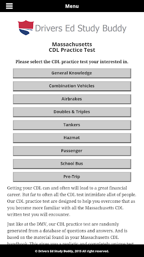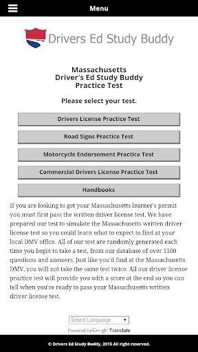 Drivers Ed Study Buddy's Massachusetts driver license test, provides unlimited free driver license practice test from a pool of over 1500 test questions. Our Massachusetts driver license test provides you with realistic test scores so you'll know when you're ready to take your written test. All of our Massachusetts driver license test are randomly generated (just like at the DMV) each time you begin a test insuring you know the information needed to pass your test and not just memorized some questions. This helps you become more familiar with the test and helps you figure out where you may need to study more.