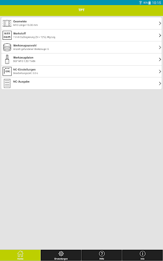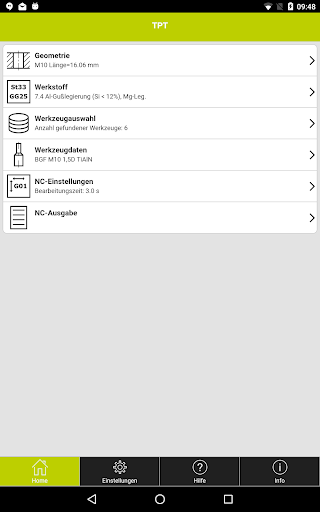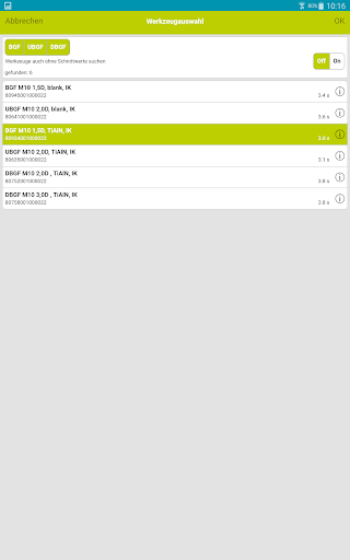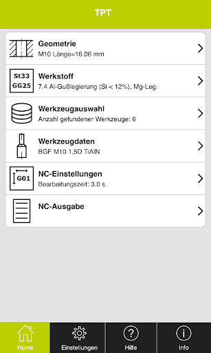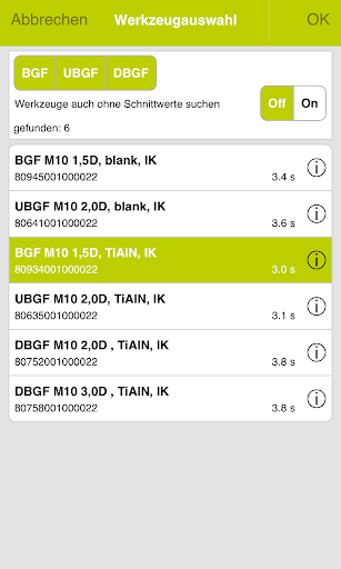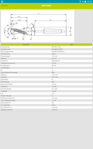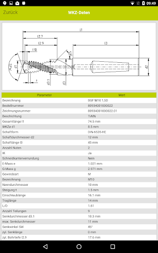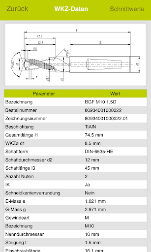 Nach Eingabe der Bearbeitungsaufgabe listet Ihnen TPT mobile alle in Frage kommenden JEL Standardgewindefräser, bzw. Bohrgewindefräser einschließlich Zeichnung und der kalkulierten Bearbeitungszeit auf.