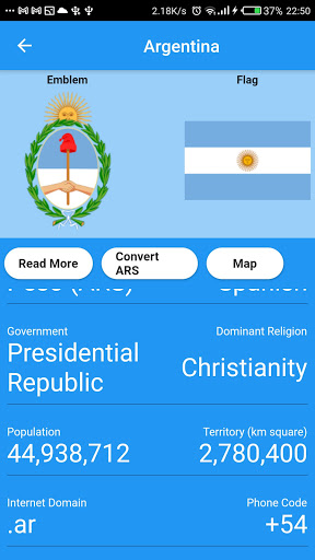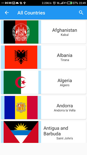 Erfahren Sie mehr über die Welt um Sie herum, indem Sie Quizzes spielen.Spielen Sie mit Ihren Freunden und Ihrer Familie.Erlernen Sie die Hauptstädte, Flaggen, Embleme, Hauptsprachen, Telefonwahlcodes, Internetdomains und viele andere der Länder der Welt.Überprüfen Sie die Währung der Länder und konvertieren Sie sie in Ihre bevorzugte Währung.Verwenden Sie Karten, um zu finden, wo sich die Länder befinden.