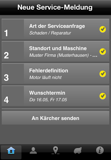 Die Kärcher Service App unterstützt gewerbliche Kunden überall und 24/7. Schnell und unkompliziert in nur vier Schritten einen Maschinenschaden melden oder eine Wartung sowie Sicherheitsinspektion bei unserem Kärcher Service beantragen. Den Maschinencode scannen, ein Foto der Maschine hinzufügen, einen Wunschtermin angeben – fertig. Die Eingangsbestätigung zu Ihrer Service-Meldung kommt unverzüglich per Mail und der Service-Techniker wird termingerecht für Sie eingeplant.