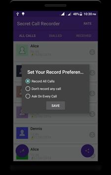 The Secret Call Recorder records all incoming and outgoing call automatically because it runs in background without noticing it. You can enable the functionality to switch on and off the secret mode. You can choose to record all your calls secretly or ask every time when you about to make or receive a call.