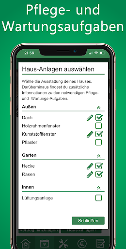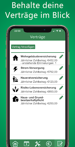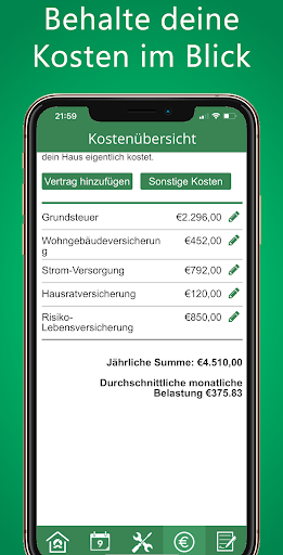 Mit dieser App bekommst du alle relevanten Hilfen, um dein Eigenheim optimal zu managen. Sie sensibilisiert dich für notwendige Pflege- und Wartungsaufgaben, unterstützt dich bei der Verwaltung der Verträge und ermöglicht es dir den Überblick über die Kosten zu behalten. So macht Hausbesitz Spaß!