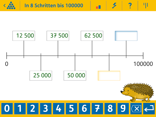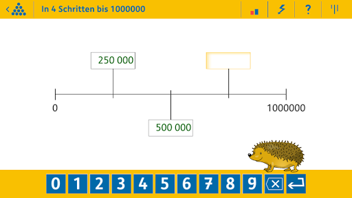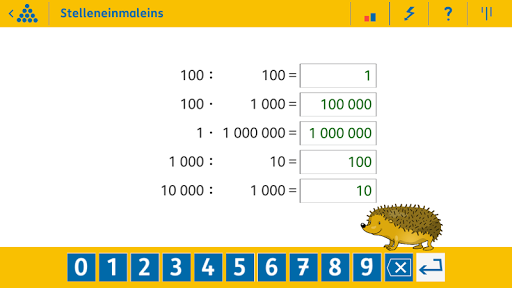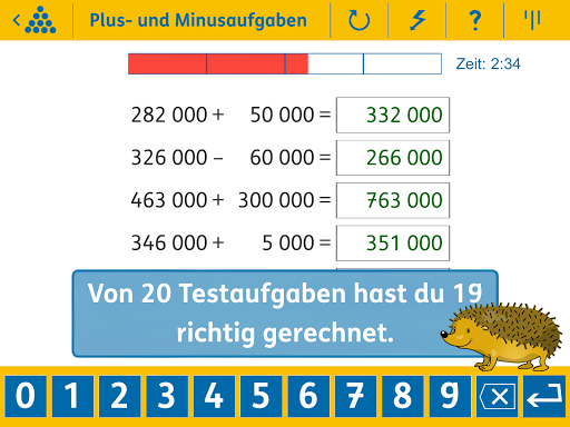 In dieser App können die Kinder selbstständig 10 grundlegende Rechenaufgaben der vierten Klasse anhand von über 1000 Aufgabenvarianten im Zahlenraum bis 1 Million üben. Beispielsweise: