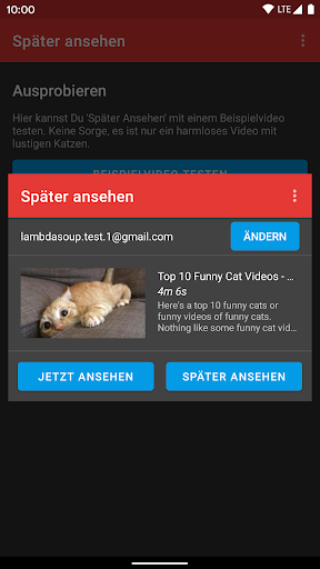 Seit 2021-02-11 hat YouTube die API zum Einfügen von Videos in Deine "Später Ansehen" Liste eingestellt. Dies bedeutet, daß die App von nun an Videos in eine Deiner regulären Wiedergabeliste einfügt.