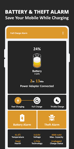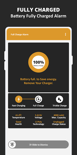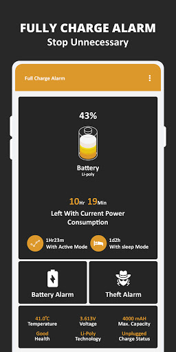Stop Over Charging - Full Battery Alarm app has an alarm that will ring when your phone’s battery is fully charged so you can unplug your phone from charging, in this manner your phone will not get overcharged and electricity will also be saved.