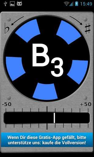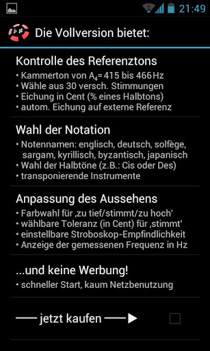 Dies ist die kostenlose "lite"-Version; sie benutzt die gleiche Stroboskop-Technologie wie die Vollversion, ist aber werbefinanziert und benutzt den fixen Kammerton A₄ = 440 Hz. Die Vollversion ist dagegen werbefrei und bietet viele Einstellungen.