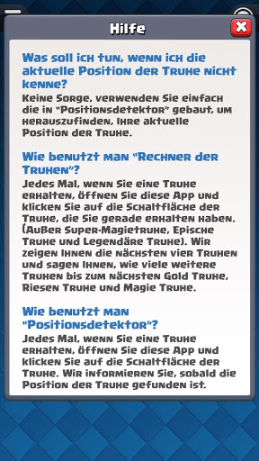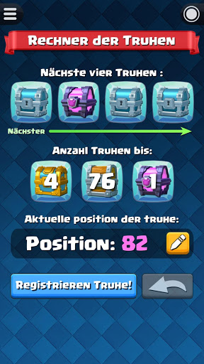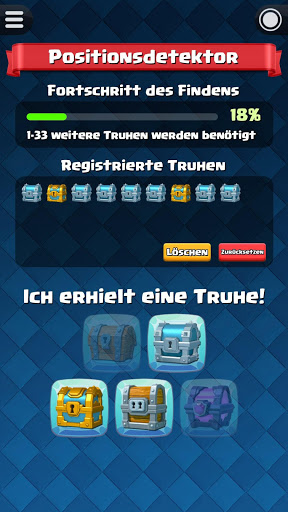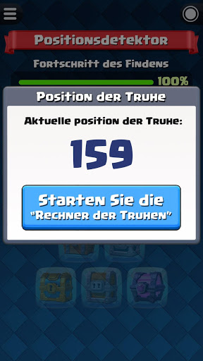 Bevor Sie mit dem “Rechner der Truhen für Clash Royale” beginnen, müssen Sie die aktuelle Position der Truhe kennen. Es ist ok, wenn Sie nicht sicher sind. Mit “Positionsdetektor” können Sie die Position der Truhe herausfinden.