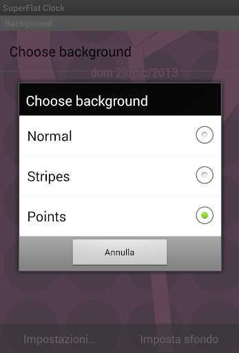 SuperFlatClock is a coloured and pop LiveWallPaper. - Flat graphic. - Background customizable (Normal/Stripes/Points) - Colorized. - Resizable - MultiTouch