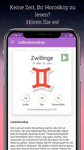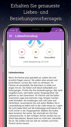 Wie wirkt sich das Universum auf Ihr Liebesleben aus? Das tägliche Liebeshoroskop zeigt Ihnen, wie Sie sich in der Liebe lustig machen und langjährige romantische Beziehungen zu einem Partner aufbauen können! Wenn Sie noch alleine sind, hilft Ihnen diese echte Horoskop App, Ihren Verlobten zu finden und auszuwählen.