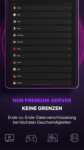 Keine Geschwindigkeits- oder Datenverkehrsbeschränkungen: Schauen Sie, laden Sie herunter, spielen Sie, senden Sie, solange Sie wollen und tun Sie es mit der höchsten Geschwindigkeit. Eine große Sammlung von Servern an Top-Standorten ermöglicht es Ihnen, auf Ressourcen zuzugreifen, die in einem bestimmten Land möglicherweise nicht verfügbar sind, oder Ihre Verbindung zu beschleunigen.