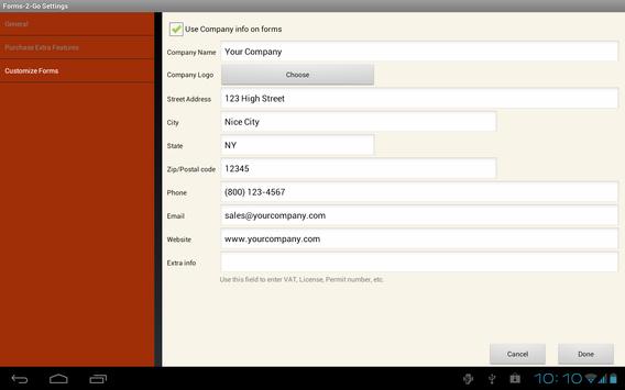 - Pre-build forms can be customized with your Company name, logo, address and contact information (requires in-app purchase).