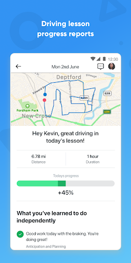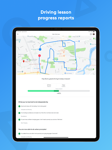 • Driving lesson reminders, progress tracking, and lesson route maps