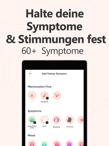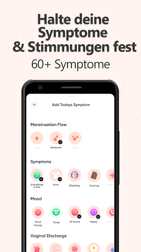 Greifen Sie auf alle Informationen über Ihre Gesundheit und Ihr Wohlbefinden zu: Der erste Tag Ihrer Periode, die Länge Ihres Zyklus, unregelmäßige Perioden, Stimmungen & Emotionen, Eisprungstage, PMS-Symptome, Geburtenkontrolle, Wachstum Ihres Babys, Intimität, Zervixflüssigkeit. Geben Sie täglich Ihre Symptome ein und genießen Sie die exklusiven, auf Sie zugeschnittenen Einblicke! Lerne, worauf du neugierig bist und lerne deinen Körper besser kennen mit den zahlreichen und einzigartigen Einblicken, von Schwangerschaft bis Hautpflege, von Beziehungen bis zu Trainingstipps...