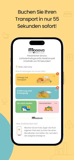 Entdecken Sie Mooova, Ihre App für den einfachen und schnellen Transport gebrauchter Möbel. Wir bieten Echtzeitverbindungen zu Einzelpersonen und Transportunternehmen mit verfügbaren Ressourcen, sodass Sie in nur 55 Sekunden die Hilfe erhalten, die Sie benötigen!