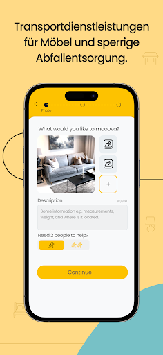 Die Verwendung von Mooova ist ein Kinderspiel – machen Sie ein Foto, geben Sie die Adresse ein und erhalten Sie einen empfohlenen Preis basierend auf der Artikelgröße, der Transportentfernung sowie dem aktuellen Angebot und der aktuellen Nachfrage. Sie haben die volle Kontrolle über den Endpreis und können ihn zu Ihrer Zufriedenheit anpassen. Sobald der Preis stimmt, übernehmen unsere Mooovers die Aufgabe und liefern zum gewünschten Zeitpunkt.