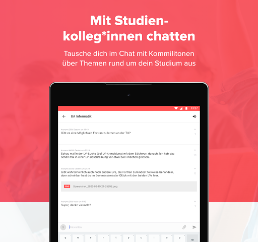 Du hast nicht alles in der Vorlesung verstanden? Kommuniziere mit deinen KollegInnen und stelle wichtige Fragen rund um deine Lehrveranstaltungen und dein Studium!