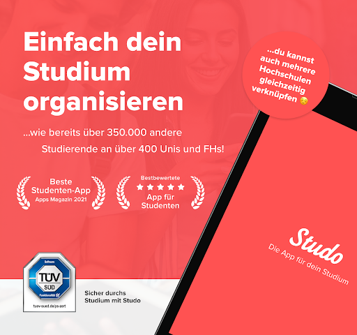 Du studierst auf einer Uni, FH, TH, TU oder PH? Manage your uni now and study smarter with Studo - your university app! Denn Studieren ist schon schwer genug, mit Studo ist die Organisation deines Studium einfach und übersichtlich: