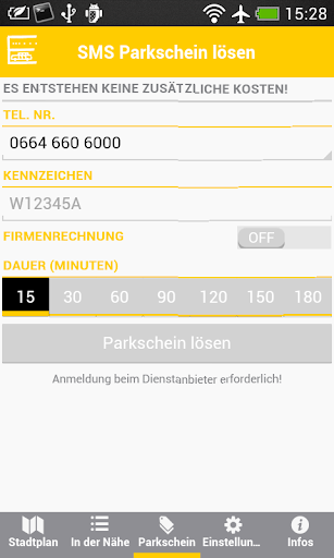 * Lösen Sie per SMS einen Parkschein direkt in der App (es fallen keine Zusatzkosten an!Anmeldung bei dem Dienstanbieter erforderlich)