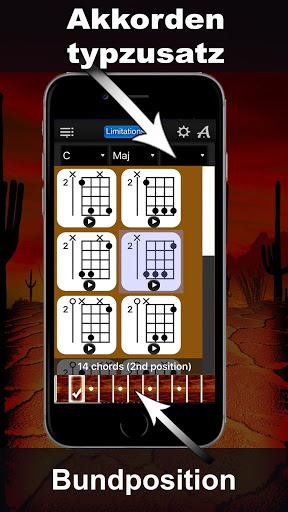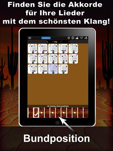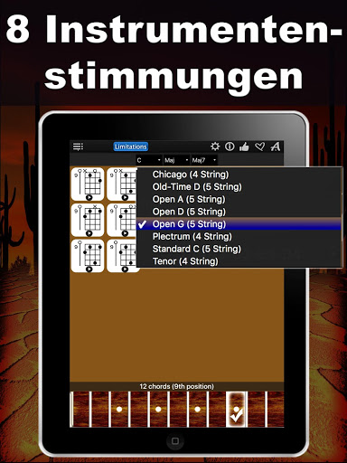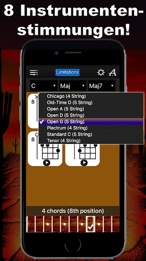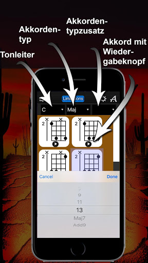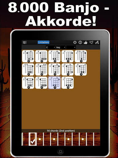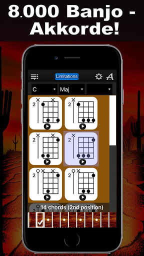 Dank eines speziell entwickelten Algorithmus, werden die Akkorde mit allen möglichen Optionen in allen 11 Positionen des Griffs in Diagrammform angezeigt. Wählen Sie einfach einen Akkordgrundton auf der linken Seite aus, einen Akkordtype in der Mitte oder auch zusätzlichen Akkordtypen auf der rechter Seite aus und durchsuchen Sie die Akkorden mit “Banjo Chords Compass Lite”!
