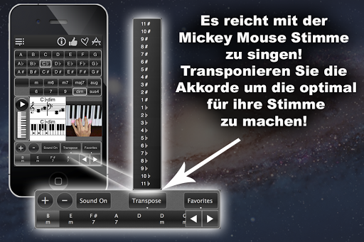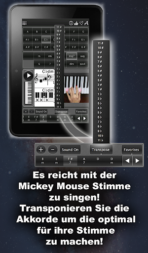 Ausserdem können Sie Ihre eigenen Akkordfolgen für Ihre Lieder erstellen und abspeichern. Sie können auch diese Akkordfolgen transponieren, um sie Ihrer Gesangsstimme anzupassen.