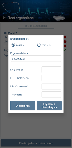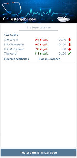 - Speichern, Bearbeiten und Löschen Ihrer Lipid-Panel-Testergebnisse (Cholesterin, Triglyceride, LDL- und HDL-Cholesterin)