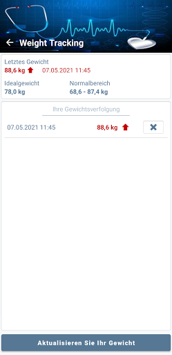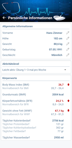 - Verfolgung des Gewichts und verwandter Parameter wie Körperfettanteil, Body-Mass-Index, täglicher Kalorienbedarf, täglicher Wasserbedarf und mehr...