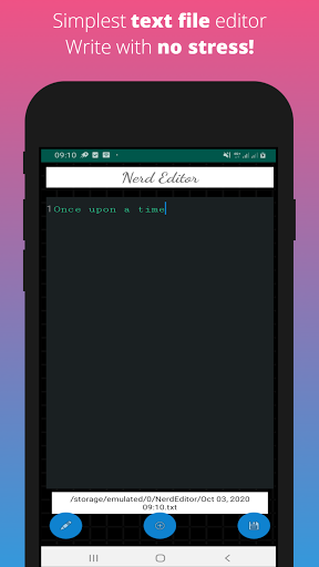 Nerd Editor is the best of the simple file editors you can find for your phone. It can be used to create new files or edit existing files with little or no hustle. It has an in-built data recovery mechanism so that loosing data while you are editing a new file (or existing one) is impossible, even if the app closes, crashes or you restart the phone. It shows line numbers as you edit, and comes with a clean, uncluttered interface to help you focus while you write.