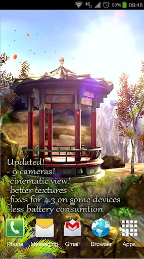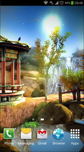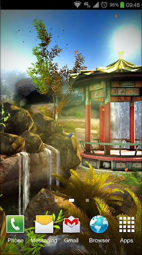 Eine erstaunliche 3D-Live-Wallpaper auf Google Play für Ihr Telefon oder Tablet! Eine vollständige 3D-orientalische Gartenszene bietet Ihnen große Stimmung und halten Sie während eines Tages ruhig. Das ursprüngliche Teehaus, Wasserfälle, Vegetation und Landschaft, fliegende Vögel und fallende Blätter geben dieses Live-Tapeten sehr realistische Look.