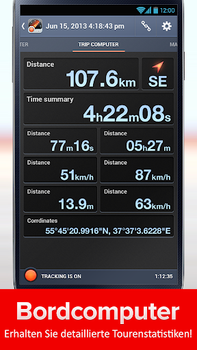 Der Bordcomputer wird Ihnen ermöglichen, Ihre Route auf der Karte kennenzulernen, die Geschwindigkeitswerte der durchschnittlichen Geschwindigkeit, der maximalen Geschwindigkeit, der zurückgelegten Strecke, der Gesamtzeit zu überprüfen, sich den detaillierten Geschwindigkeitsplan usw. anzusehen. Und um sich unter allen Routen nicht zu verlieren, haben wir die Möglichkeit hinzugefügt, diese zu benennen, wie es Ihnen gefällt.