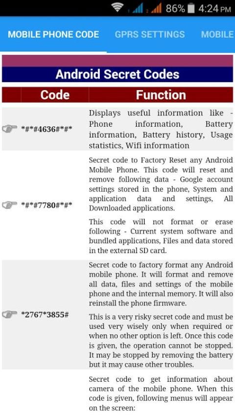 In this Free App that Works OFFLINE, you will find mobile phone codes list (some people call it mobile phone secret codes). You will find following useful codes: