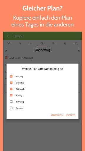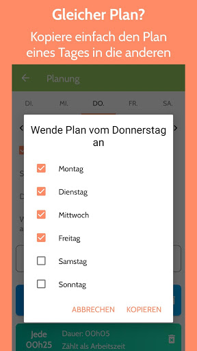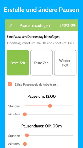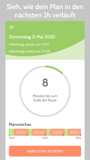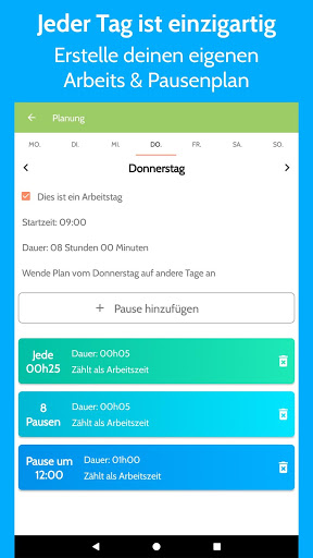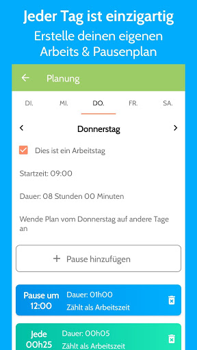 • Plane deinen eigenen Arbeitstag mit Arbeitszeit und Art und Anzahl der Pausen