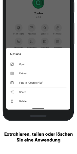 Erfahren Sie von innen, wie eine ausgewählte Anwendung funktioniert. Die Liste der Aktivitäten, Dienste, verwendeten Berechtigungen und sogar die Details des Anwendungssignaturzertifikats sind in Ihren Händen.