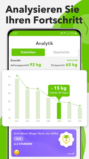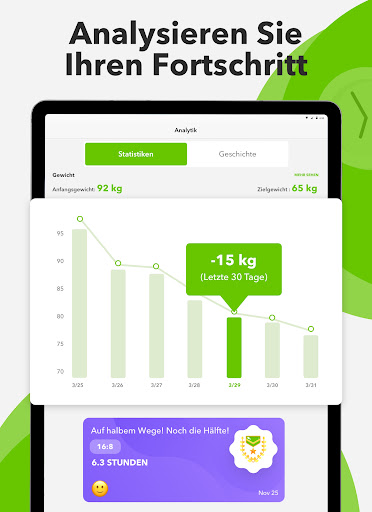 Verfolgen Sie Ihren Fortschritt, zeichnen Sie Ihre Daten auf, während Sie sich Ihrem Zielgewicht nähern, sowie Ihren Fastenverlauf. Der Analysebereich liefert Ihnen die Daten, um Sie über Ihren Gewichtsverlauf zu informieren.