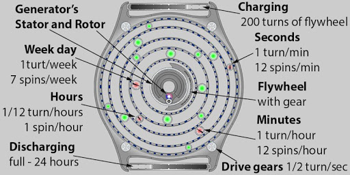 The reverse design with visualization of engagements and self-winding mechanism simulating charging by generator at the center and symmetric batteries displaced in armband shifts.