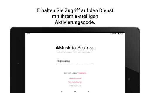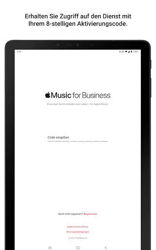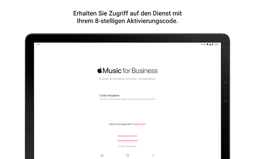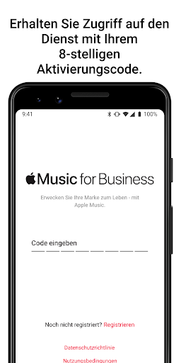 Diese App ist nur für Apple Music for Business-Kunden verfügbar. Um den Dienst auf Ihrem Gerät nutzen zu können, benötigen Sie ein Business-Abonnement und einen 8-stelligen Aktivierungscode.