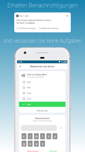 Lernen Sie die englische Sprache mit Elixir - dank cleverer Algorithmen, die Wörter auswählen, und der wissenschaftlichen Methode der Intervallwiederholung werden Sie auf natürliche Weise Wörter lernen. Das neuronale Netz wird Ihnen bei der englischen Aussprache helfen. Mit Elixir müssen Sie nur noch Englisch lernen: alles andere erledigt die App für Sie. Sie bietet Ihnen die richtigen Aufgaben zu den richtigen Zeitpunkten, so dass Sie englische Wörter lernen und die Aussprache üben können, wenn es für Sie am bequemsten ist. Benachrichtigungen lassen Sie keine Aufgabe verpassen! Der Vokabeltest schätzt Ihr Sprachniveau ein, so dass die App Ihnen englische Vokabeln anbietet, die am besten zu Ihren Kenntnissen passen. Mit Elixir lernen Sie die englische Sprache mit Leichtigkeit und Geschmack. Der Sprechtest mit neuronalem Netz bewertet Ihre Aussprachefähigkeiten. Sie werden: