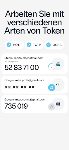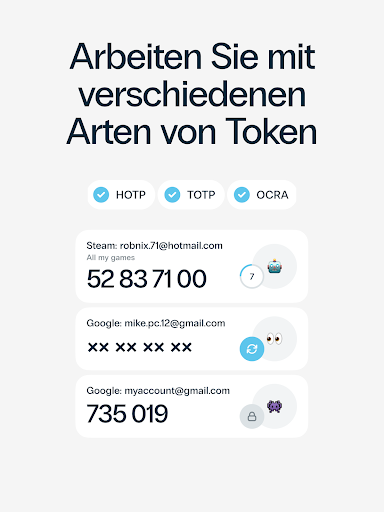 - Die 2FA-App ist mit einer Vielzahl von Webseiten und Anwendungen kompatibel, da sie alle OATH-Einmalpasswort-Generierungsalgorithmen wie HOTP, TOTP und OCRA unterstützt.