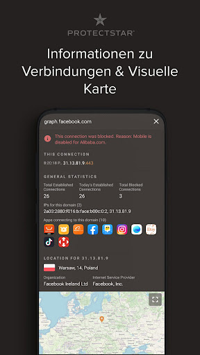 Lass dir in Echtzeit anzeigen, welche Apps auf welche Server zugreifen oder mobile Daten verschwenden. Mit einfachen Filterregeln lassen sich sogar bestimmte Verbindungen einer App zulassen oder ablehnen.