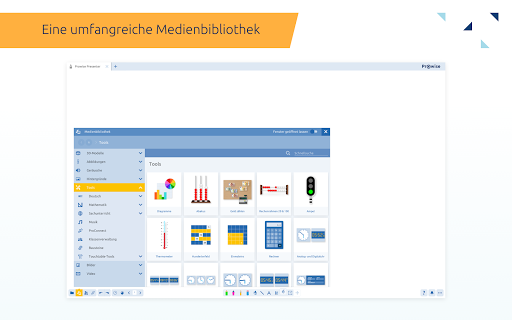 Schaffen Sie unendliche Möglichkeiten. Die kostenlose Lernsoftware Presenter ist für Lehrkräfte und Schüler entwickelt worden. Mit der umfassenden Medienbibliothek erstellen Sie Lektionen, Vorträge, Präsentationen und Quiz. In dieser Medienbibliothek finden Sie unter anderem (Touch-Table-)Tools, Bilder, 3D-Modelle, Sounds, Hintergründe, Videos und Bausteine, mit denen Sie Ihre Presenter-Datei interaktiv gestalten können.