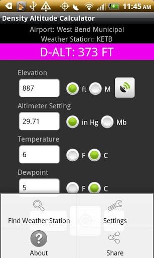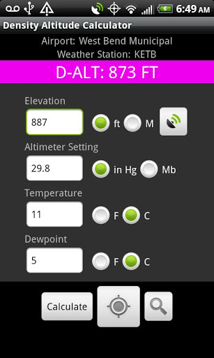Accurately calculate Density Altitude using Elevation, Pressure, Temperature, and Dew Point.