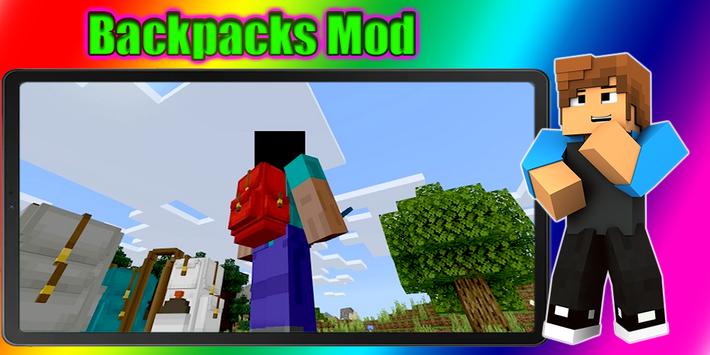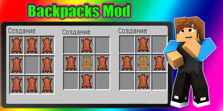 The Minecraft Backpack Mod app adds three backpacks: small, medium and large. To get a backpack, you can use craft or creative mode inventory. To open the backpack interface just click on it. If you want to repaint your backpack, then just use any dye! Just go to the backpack and it will automatically be on the back. If you want to remove it, then jump and press the creep button.