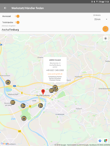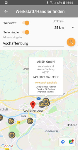 Finden Sie schnell und einfach eine Werkstatt oder einen Teilehändler mit allen nötigen Kontaktinformationen in Ihrer Nähe. Sie können die Werkstatt oder den Teilehändler direkt kontaktieren über die angezeigten Kontaktdaten oder Ihre Route dorthin direkt planen.